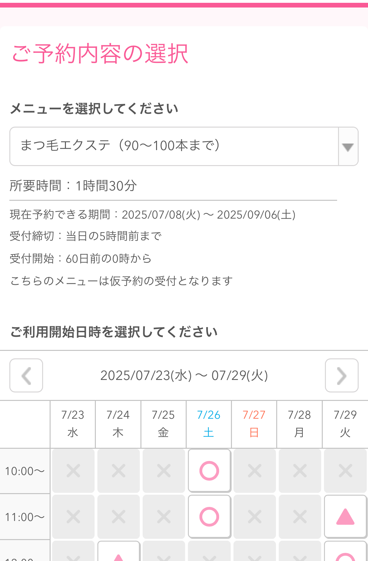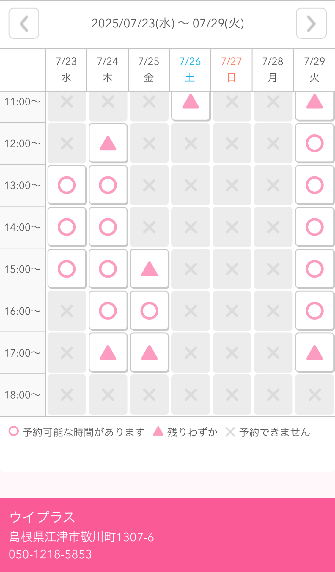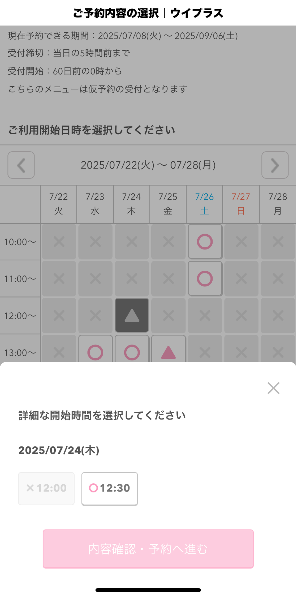 ※下の画像ですと 7/24(水)12:00にピンク▲がございます。▲の場合、12:00もしくは12:30のどちらかが空いておりますので空いている時間を選択します。